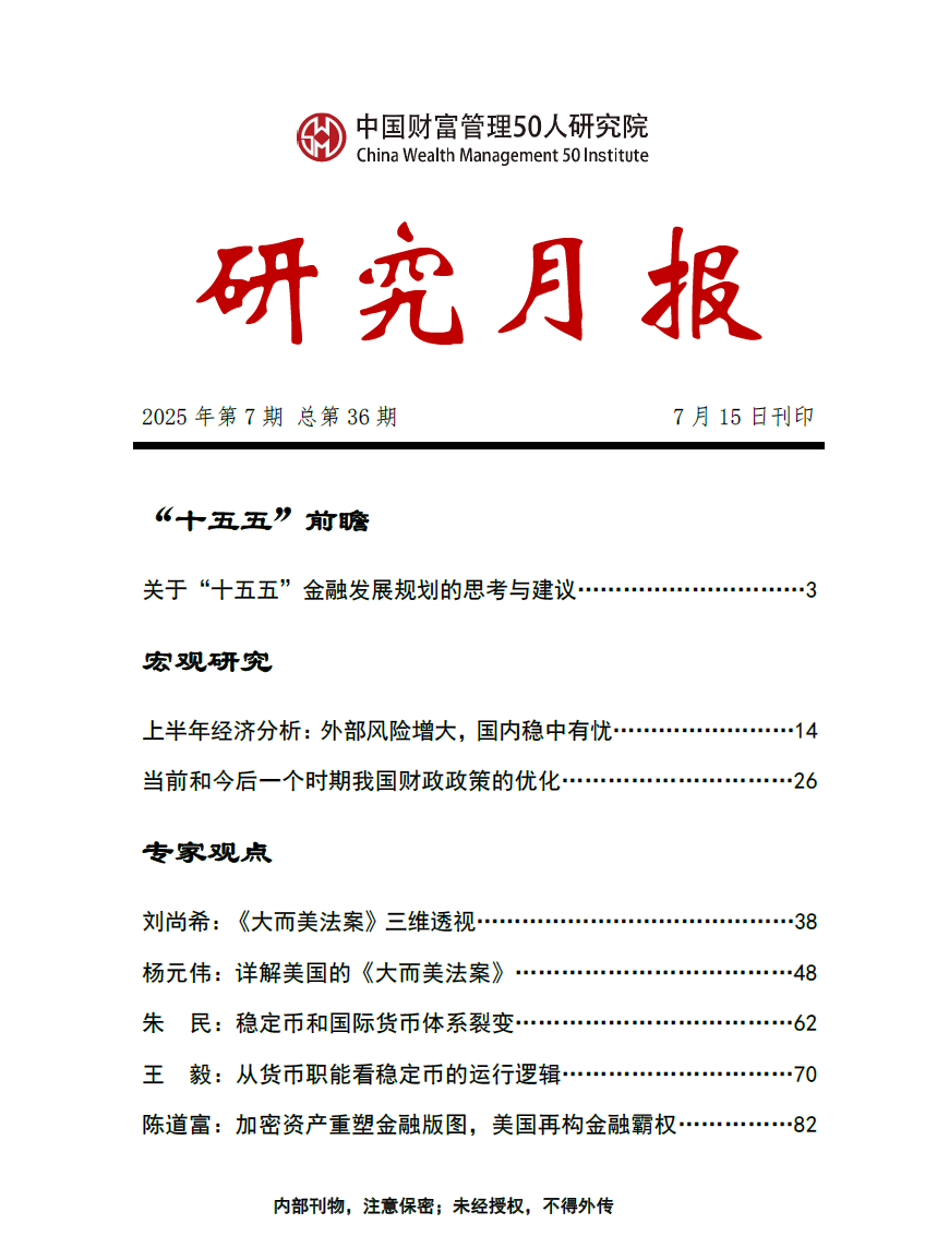 “专家观点”栏目收录了刘尚希、杨元伟、朱民、王毅、陈道富五位专家的文章,对美国《大而美法案》、稳定币与加密资产等热点议题展开深入探讨分析。