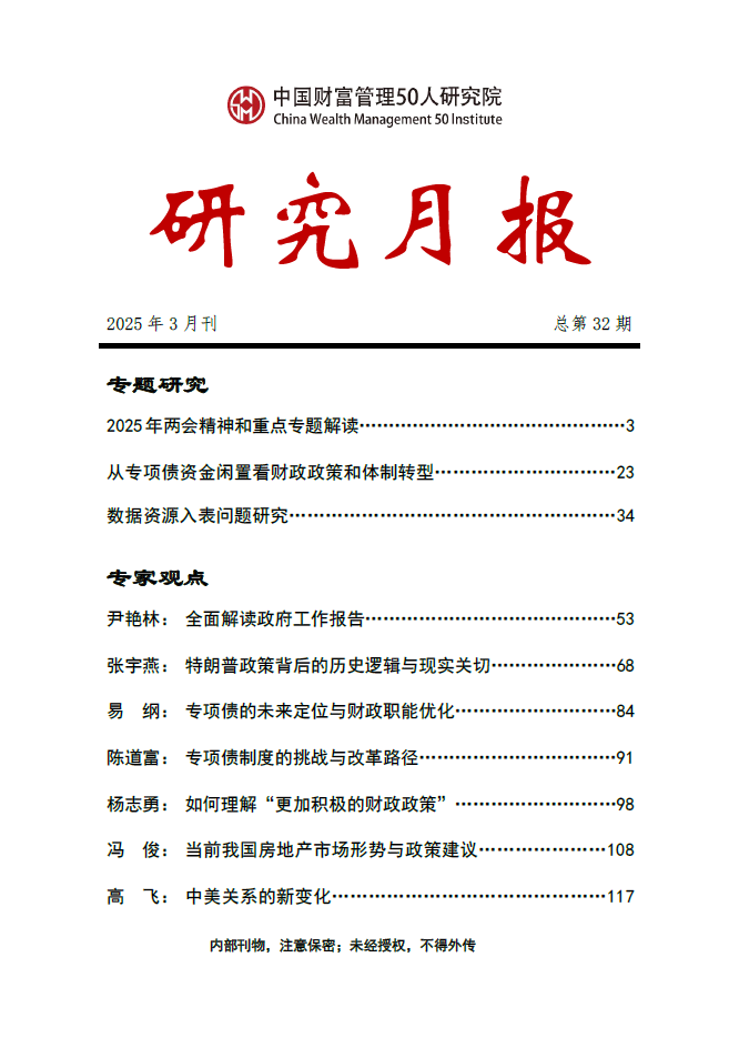 “专题研究”栏目收录了三篇研究报告。3 月初,我国召开“两会”,《政府工作报告》合理设定了积极的多元经济发展目标,发挥了“鼓舞人心、提振信心、凝聚民心和展示决心”的作用。《2025 年两会精神和重点专题解读》从外交、财政政策、货币政策、民生就业、房地产方面解读重点专题,并提出相关建议。